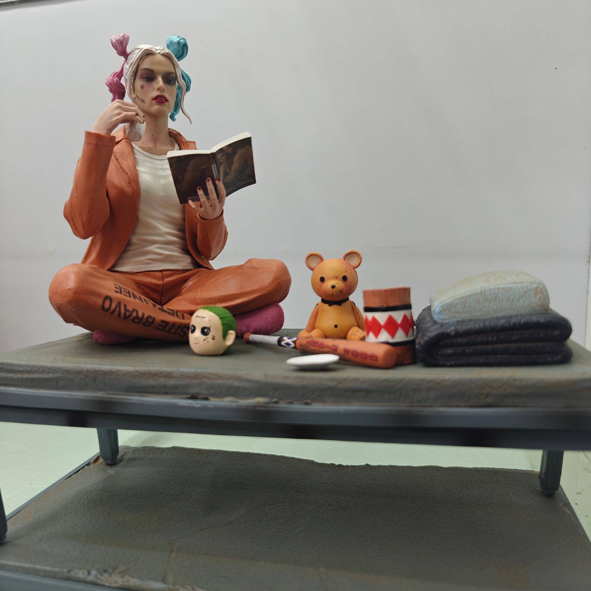 Step into the chaotic world of Gotham with this 30cm Harley Quinn collectible figure, capturing the iconic anti-heroine in her calm yet twisted prison moment. Dressed in her orange inmate outfit with playful pink and blue pigtails, Harley is seen casually reading a book—surrounded by her quirky accessories that reflect her unpredictable personality.