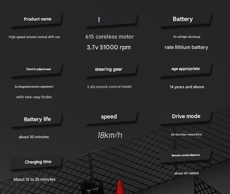 Equipped with a 4-wheel drive system and a 615 hollow cup high-speed motor (51,000 RPM), it delivers impressive handling and acceleration. The gyroscope system ensures stability during high-speed drifts, while the double door light function enhances realism. With its 2.4GHz remote control system, you get strong anti-interference and the ability to race multiple cars together. The high-rate lithium battery provides about 30 minutes of playtime with a quick charging time of 15–25 minutes.